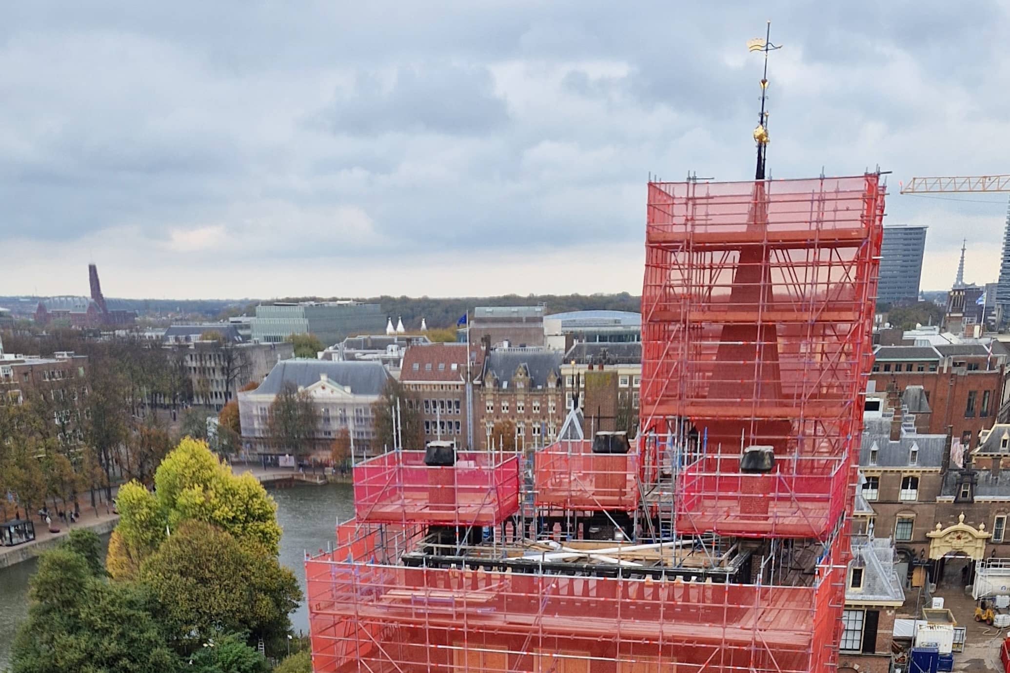 De eeuwenoude Mauritstoren op de hoek van het Binnenhof is sinds september 2025 ingepakt door steigers en rood steigerdoek. Wat ...