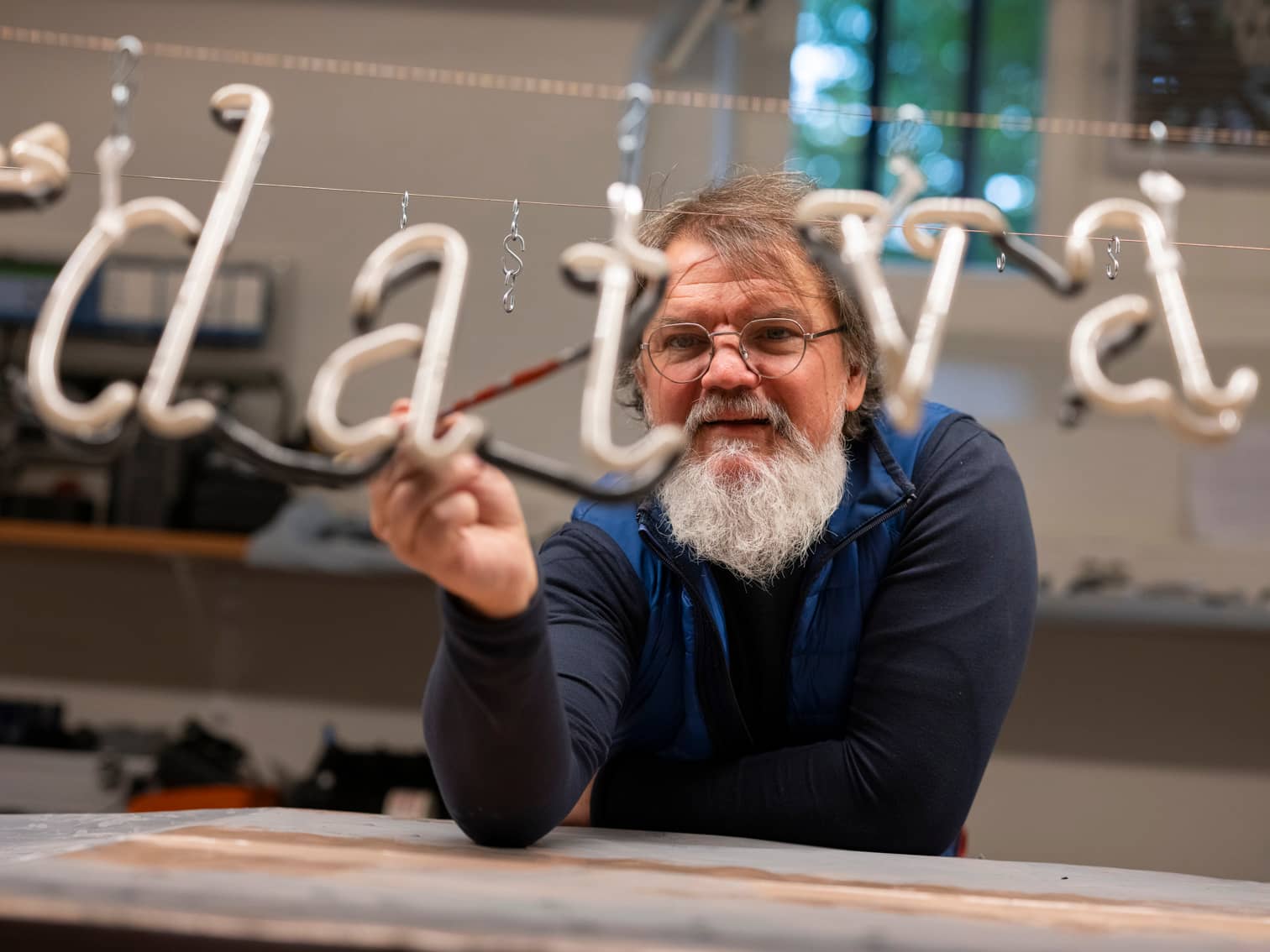De letters van Spinoza hangen aan een draadje. Maar dat is tijdelijk. Zodra Italiaanse neonspecialisten de glazen letters hebben ...