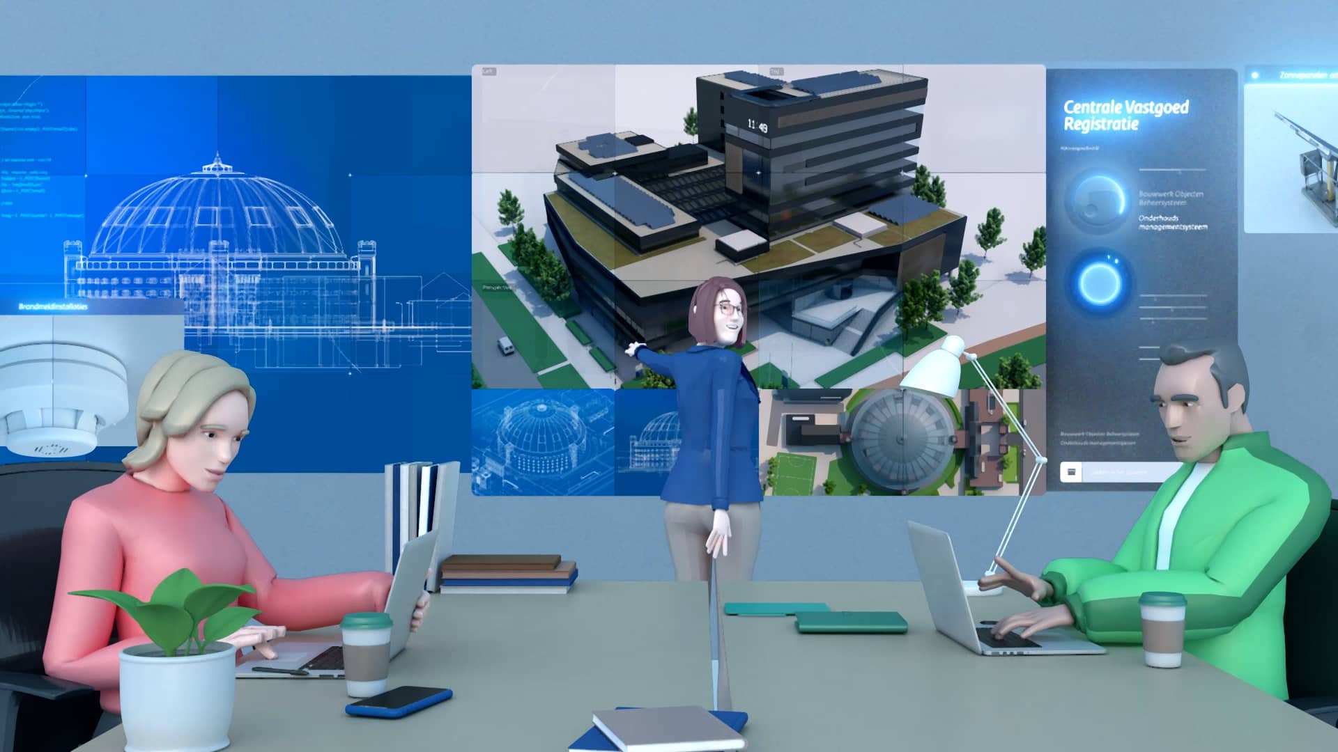 Jenny Ritskes (midden) in de animatie over gebouwinformatie bij het RVB
