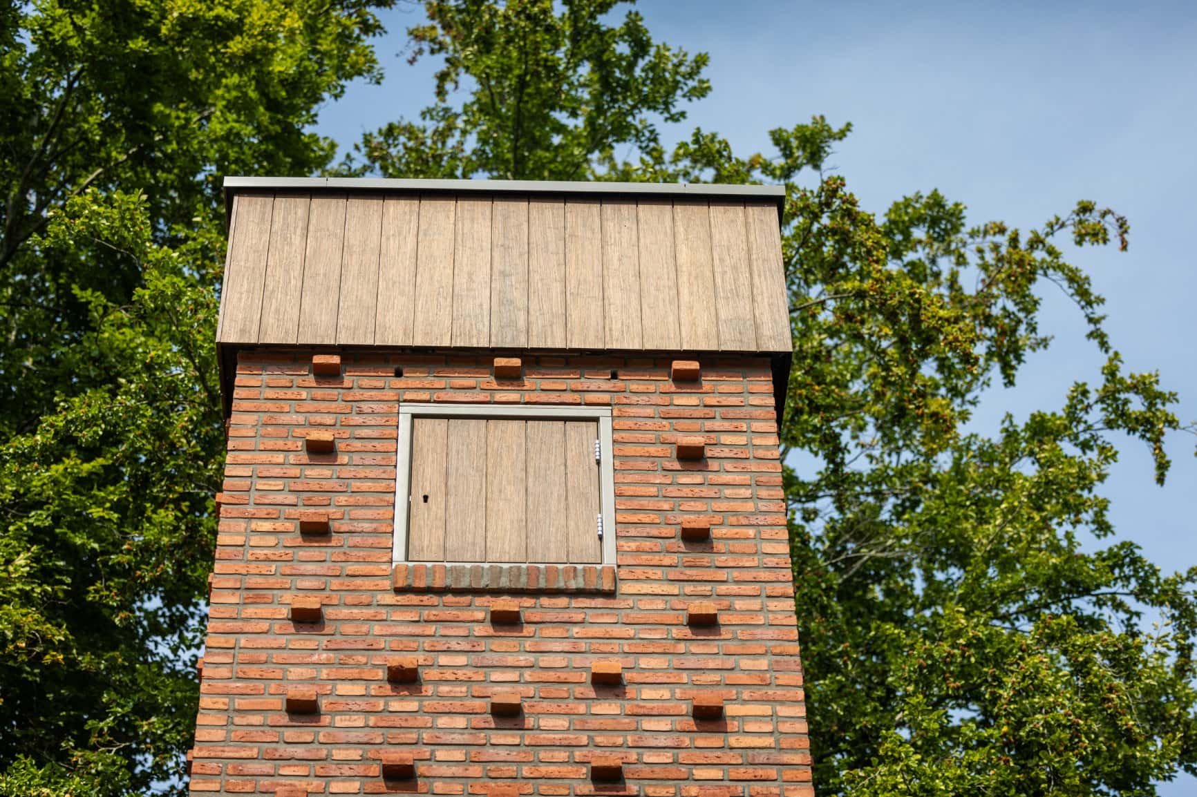 Wie met de trein Assen binnenrijdt, kan zien hoe dat compensatieplan in baksteen vorm heeft gekregen. Dicht bij het spoor staat een nieuwe toren van ruim negen meter hoog en twee meter breed. Binnenin is het één en al spouwmuur. Dankzij de drievoudige spouw is er altijd een plekje waar de temperatuur voor vleermuizen goed is. En er zijn meer dan genoeg stoot- en lintvoegen waar vleermuizen naar binnen kunnen kruipen. De toren is ruim voor de winter opgeleverd. Hun oude winterverblijf (het kantoor uit de jaren tachtig) is al grotendeels gesloopt. Komende winter gaat Tromp voorzichtig in de toren kijken of de vleermuizen het nieuwe onderkomen hebben ontdekt.