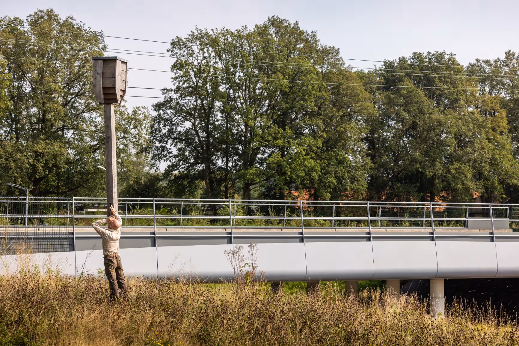 Met de sloop zijn de vleermuizen niet beroofd van hun enige dagverblijfplaats. ‘Vleermuizen hebben een netwerk van verblijfplaatsen’, vertelt Tromp. ‘Ze kunnen dus ook naar andere gebouwen of woningen. En wat we nog extra gedaan hebben, is dat we in een straal van 200 meter rondom de gebouwen zo’n 70 vleermuiskasten aan bomen hebben gehangen. Als het nieuwe gebouw klaar is, mogen die kasten weg. Want ook in het nieuwe gebouw worden vleermuisverblijven ingebouwd.’ Tenslotte krijgen de vleermuizen er nog een tweede verblijf bij. Twee oude liftschaften blijven staan en worden verbonden tot één groot extra vleermuisverblijf.