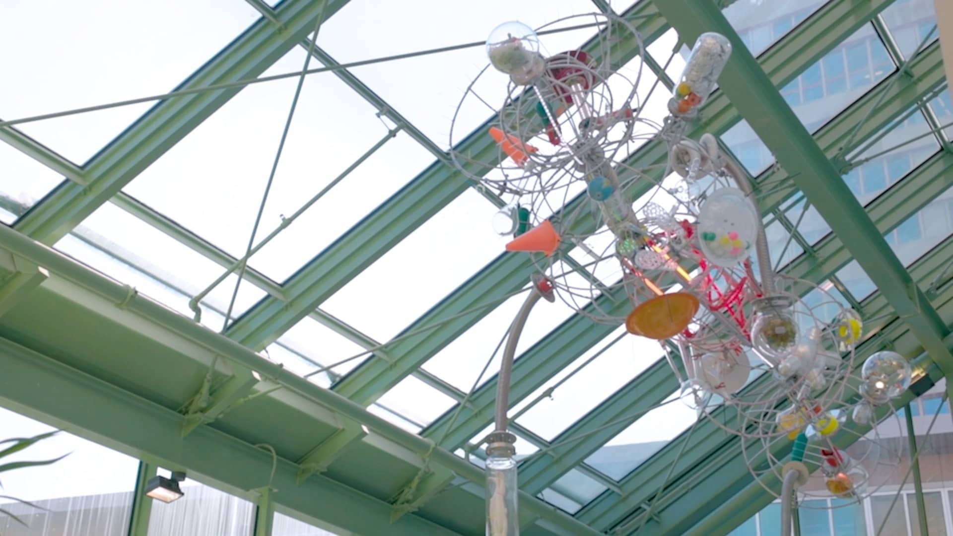 Het veelkleurige en knipperende kunstwerk van De Paris hangt in de hal van de Bezuidenhoutseweg 73 in Den Haag waar de ministeries van Economische Zaken en Landbouw, Visserij, Voedselzekerheid en Natuur huizen. ‘De defecte en verouderde lichttechniek en de elektronische aansturing zijn vervangen’, vertelt Tanja Karreman, senior adviseur Rijkscollectie percentagekunst. ‘Dat wil zeggen dat de halogeenverlichting plaats heeft gemaakt voor een zuinige led-variant. En de oude transformatoren zijn vervangen. Daarnaast is er een timer gekoppeld is aan de verlichting van het pand.’ Karreman heeft er ook op toegezien dat er kleine ventilatoren voor de koeling zijn gemonteerd waardoor de levensduur van de elektronica verlengd wordt. Je ziet ook duidelijk dat het staalwerk en glaswerk zijn gereinigd en er kunststof onderdelen zijn vernieuwd. Alle kleuren en het sprankelende licht zijn weer goed te zien. Wil je het lichtobject bekijken? Vanaf de Theresiastraat heb je goed zicht op Particles.