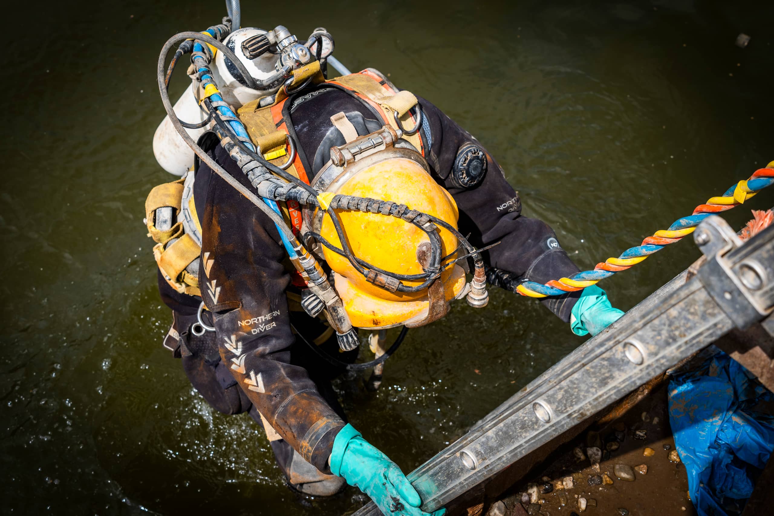 Een duiker gaat te water om de betonstort op de bodem te controleren.