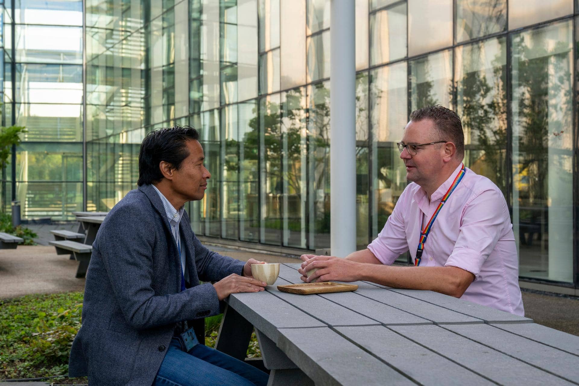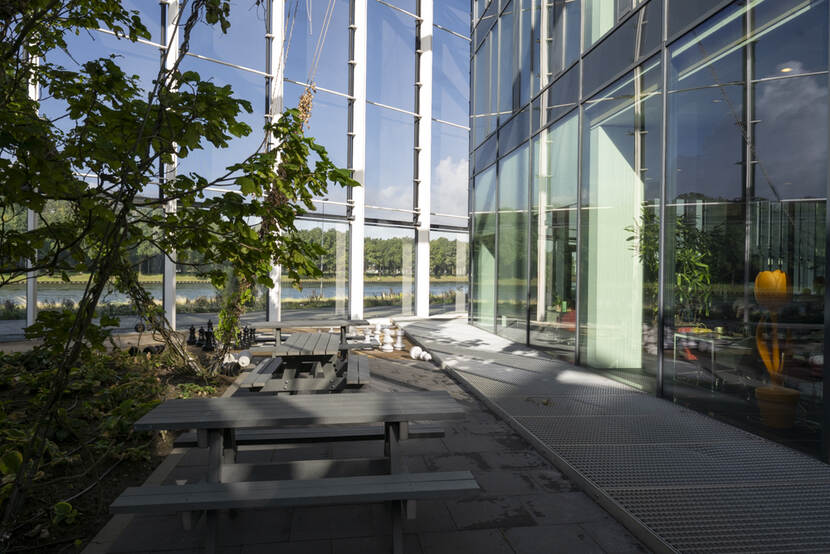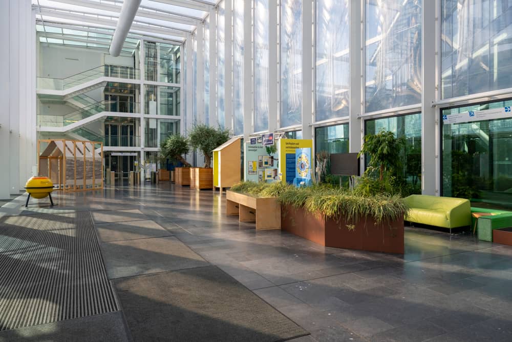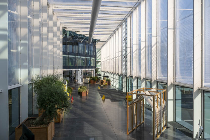 Het bestaande café wordt daarom vergroot en heringericht met meer formele en informele zitruimten op de begane grond. ‘De ruimte met lange en grote serres wordt straks een ontmoetingsplein met een restaurant. Ook komen er twee nieuwe paviljoens op de begane grond. Eén wordt een eventruimte, die op te delen is in twee kleine ruimten of één grote ruimte. In het andere paviljoen kun je formeel of informeel werken’, zegt Van de Velde. Voor meer groenbeleving wordt de binnentuin heringericht. Die liep eerst door naar buiten. De paviljoens sluiten straks de tuin af, waardoor je een soort patio krijgt. In het atrium komen verder grote bomen te staan. Het groenconcept wordt doorgetrokken tot op de werkvloer.