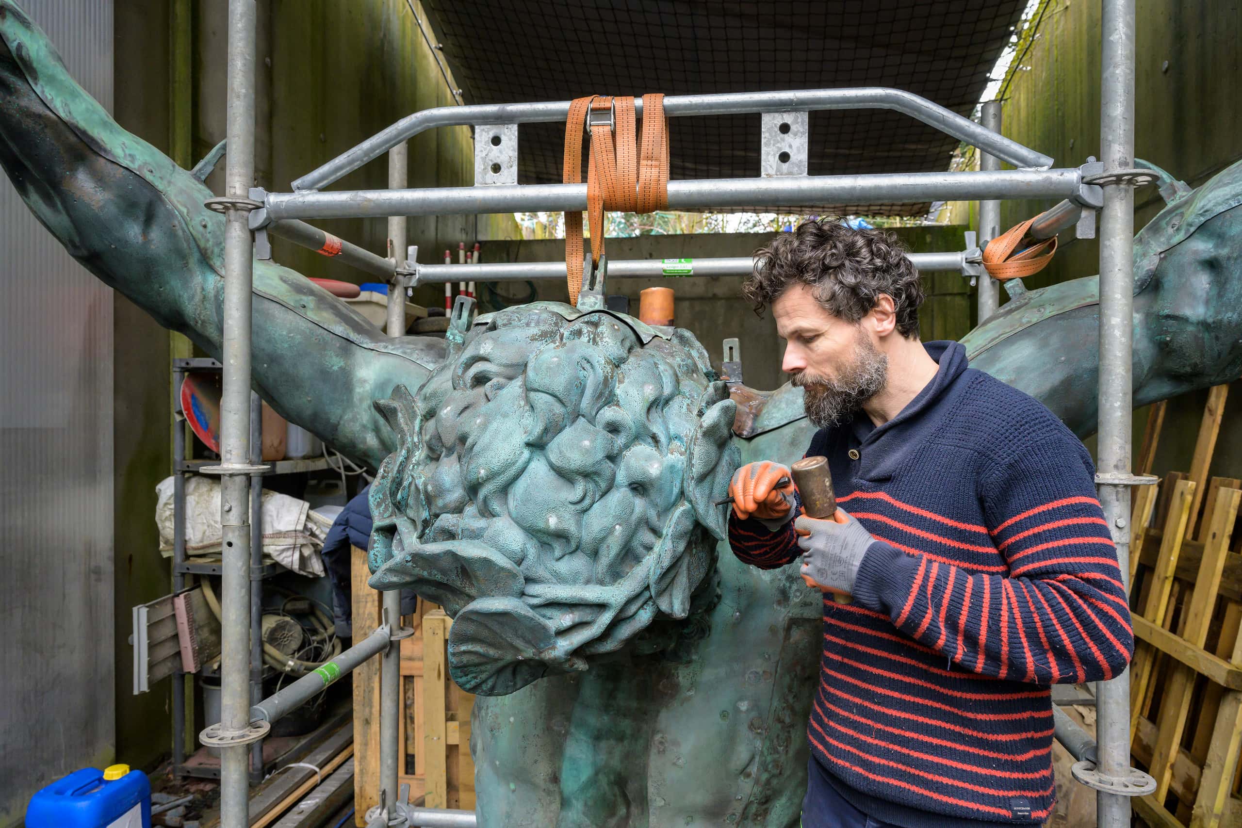 De zure regen behoort inmiddels tot het verleden. Het groene laagje op de beelden heeft Biront eraf gezandstraald met een mengsel van notenschillen. Dat is hard genoeg om de oxidatie te verwijderen, maar niet zo hard dat het brons beschadigd raakt. De beelden zijn nu weer donker en dat blijft ook zo, zegt Biront. ‘De opwarming van de aarde doet voorlopig niets verkeerd met het brons.’