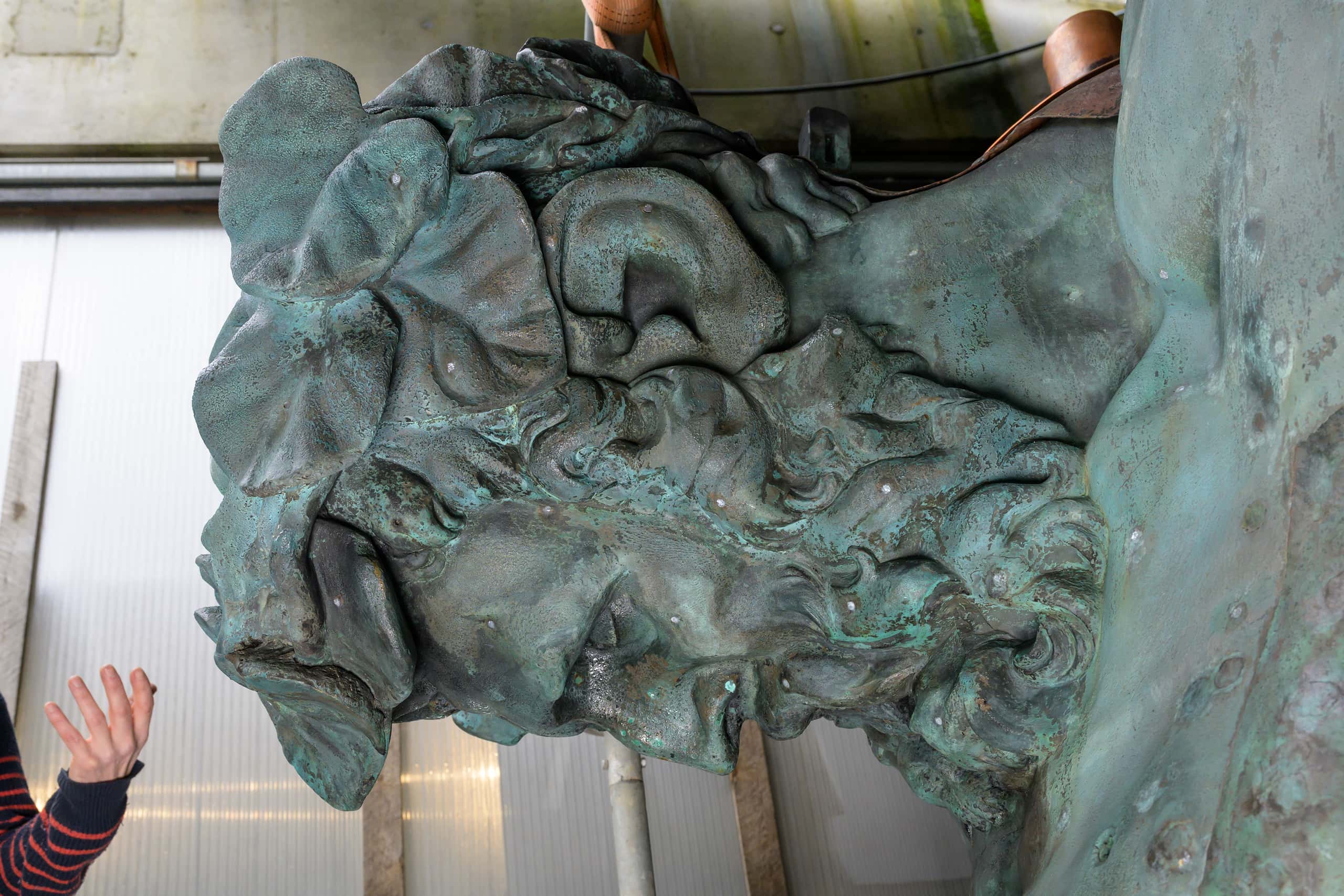 De Atlas op het dak heeft hij waarschijnlijk niet meer gezien, denkt Biront. In 1665 was hij teruggekeerd naar Antwerpen. Helemaal zeker is ook niet waar we precies de hand van de meester zien. ‘Hij had vooral een superviserende rol. Hij was een soort ateliermanager die het ongetwijfeld allemaal zelf kon. En het ongetwijfeld in sommige gevallen ook zelf deed. Maar het is niet zo dat hij het beeld van a tot z heeft gemaakt. Timewise is dat onmogelijk. Maar hoe dichter je naar het eindresultaat komt, hoe groter de kans dat je zijn hand ziet.’ Jammer genoeg ontgaat je vanaf de straat de verfijning van Quellinus’ werk. Alleen dichtbij zie je de details van de levensechte gekrulde lokken. En ook de ernstige blik van Atlas die het hemelgewelf moet dragen.