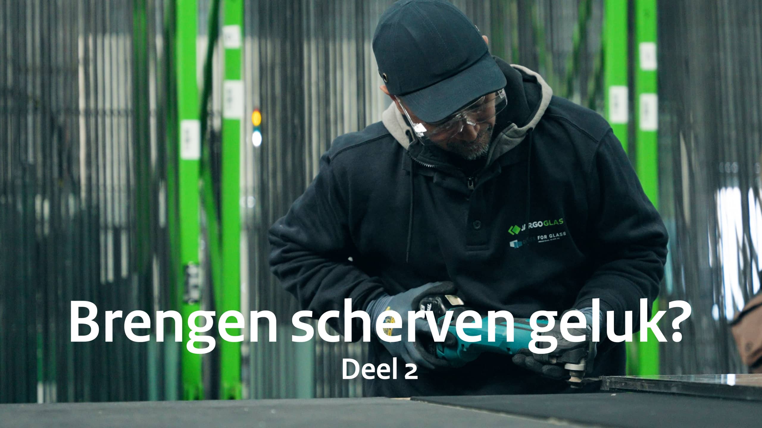 (Een hal staat vol met metershoge glasplaten. In grote, witte letters verschijnt de beeldtitel: Brengen scherven geluk? Deel 2.)