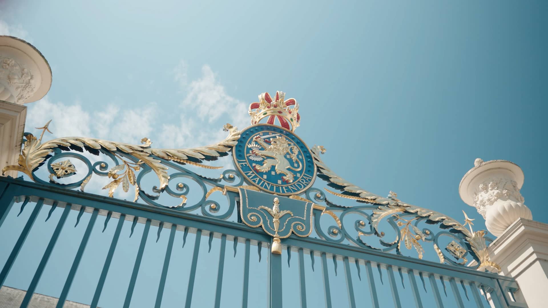 (In het zonnige Den Haag komen mensen aanfietsen bij Paleis Noordeinde. Boven de poort prijkt de Nederlandse leeuw, een rood lint leidt naar de ingang.)
